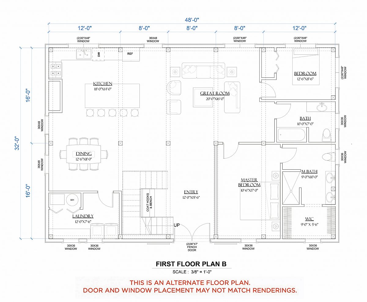 - Floor plan B is an alternate plan. Door and window placement may not match renderings.